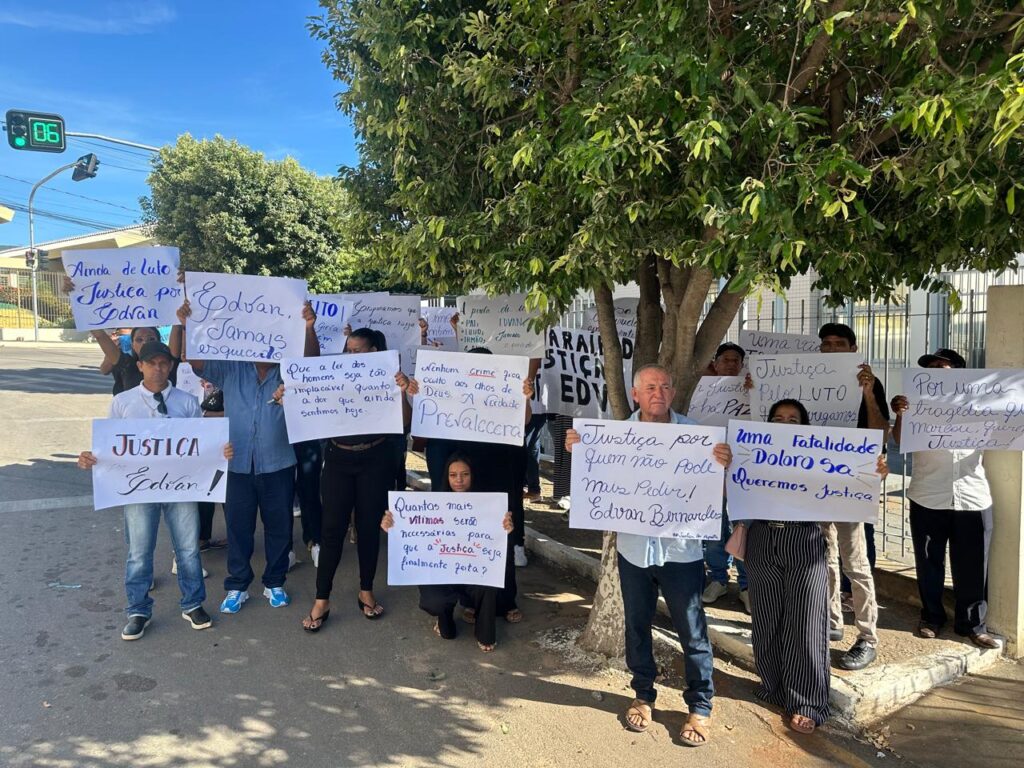 Do lado de fora do fórum, um grupo realiza uma manifestação pedindo justiça. Logo nas primeiras horas do dia, o local foi tomado por pessoas com cartazes, faixas e camisetas com fotos da vítima. As mensagens cobram responsabilização e reforçam o apelo para que o caso não fique impune.