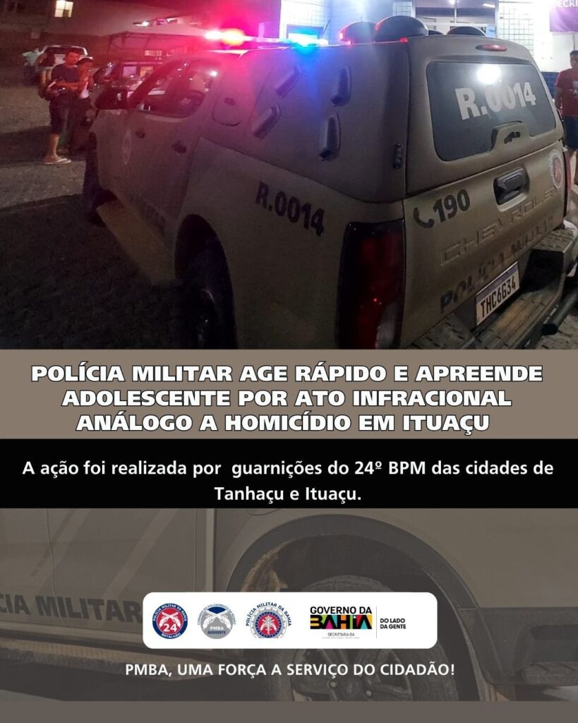 A Polícia Militar, por meio de uma ação conjunta das guarnições do 24º BPM das cidades de Ituaçu e Tanhaçu, realizou a apreensão de um adolescente de 16 anos de idade no início da noite desta segunda-feira (9), suspeito de envolvimento em um ato infracional análogo ao crime de homicídio ocorrido no distrito de Tranqueiras.